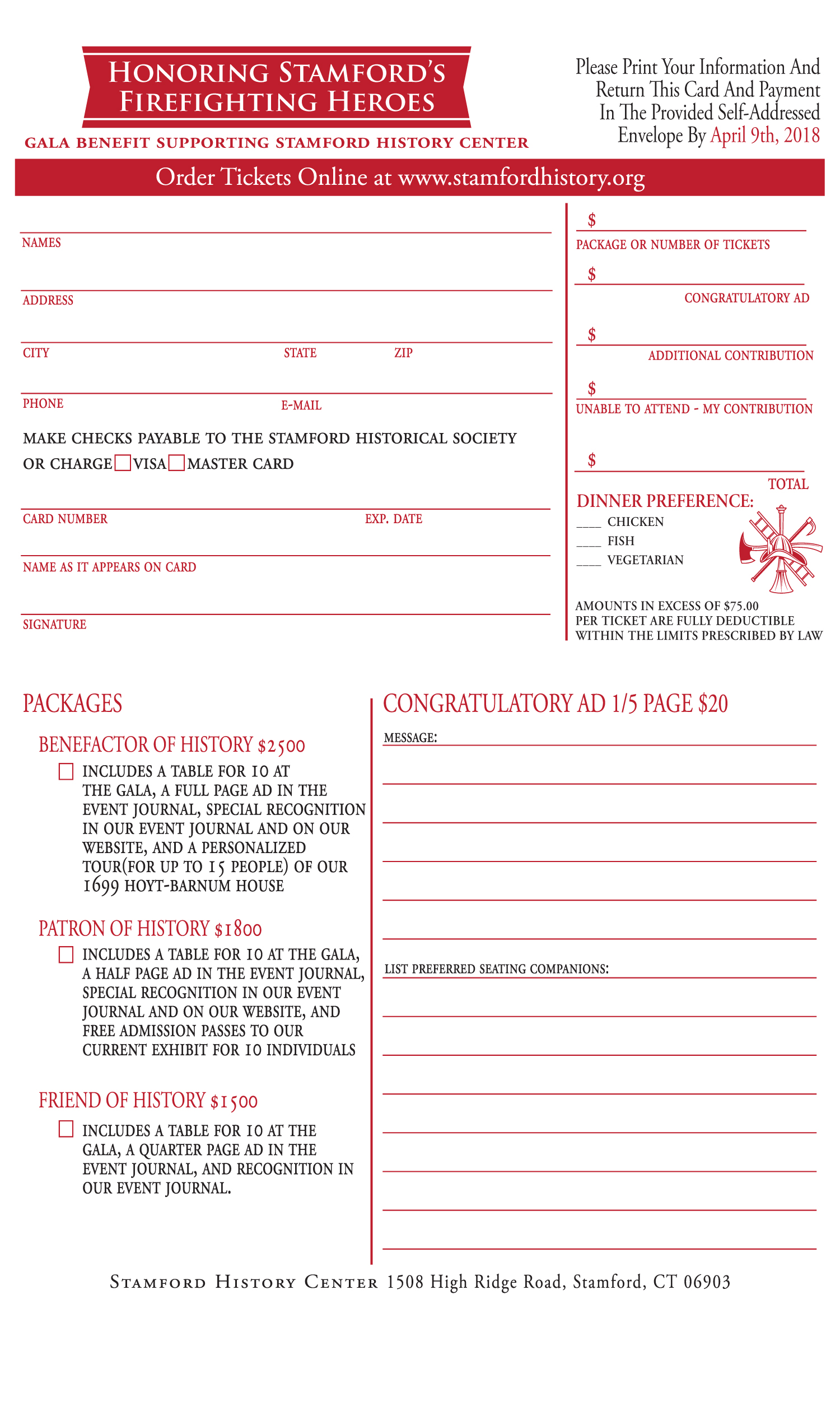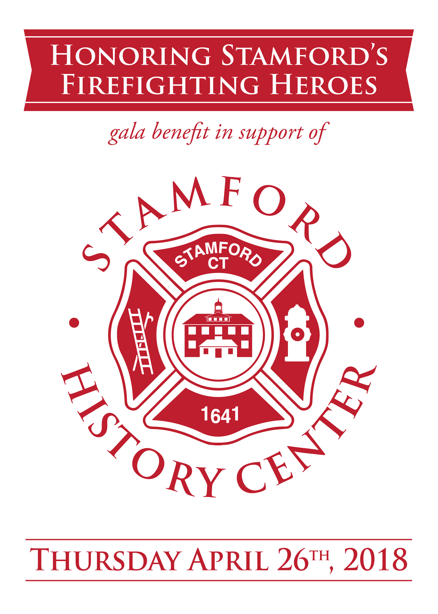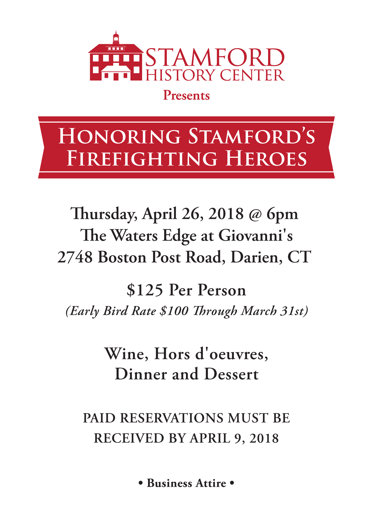 You are cordially invited to the Stamford History Center (formally the Stamford Historical Society) gala benefit dinner in honor of “Stamford’s Firefighting Heroes” on Thursday, April 27, 2018  The event will be held at the “The Waters Edge at Giovanni’s”, 2748 Boston Post Road, Darien, CT (which is on the City line with Darien). The cost of the dinner is $125 per person and includes Wine, Hors-d’oeuvres, dinner, and dessert.  The deadline for paid reservations is April 9, 2018.