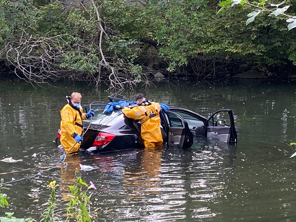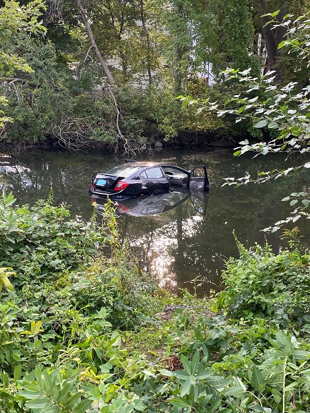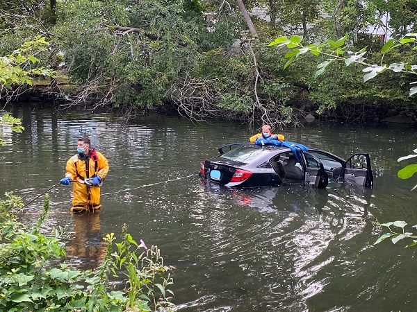 STAMFORD, CONNECTICUT – Stamford firefighters responded to a single vehicle collision in downtown Stamford that involved a vehicle submerged in the Rippowam River.