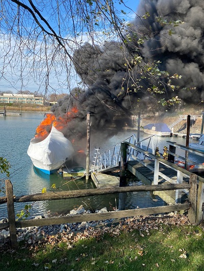 STAMFORD, CT (November 21, 2020) – At 12:09 PM, Stamford firefighters were alerted to a report of a large boat on fire near several residences in the Dolphin Cove neighborhood of Stamford. 3 Engine Companies, 1 Ladder Truck, 1 Rescue Company, the Fire Boat, and the Shift Commander responded bringing a total of 22 fire personnel to the scene.