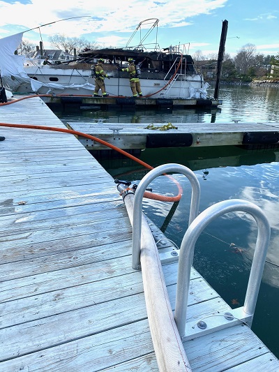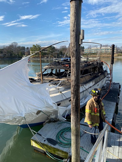 Firefighters arrived on scene in less than four minutes and found a 38-foot cabin cruiser that was well-involved in fire and located at a dock behind 109 Dolphin Cove Quay. Fire personnel were able to quickly extinguish and contain the fire and prevent any environmental damage to the harbor.