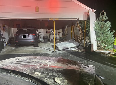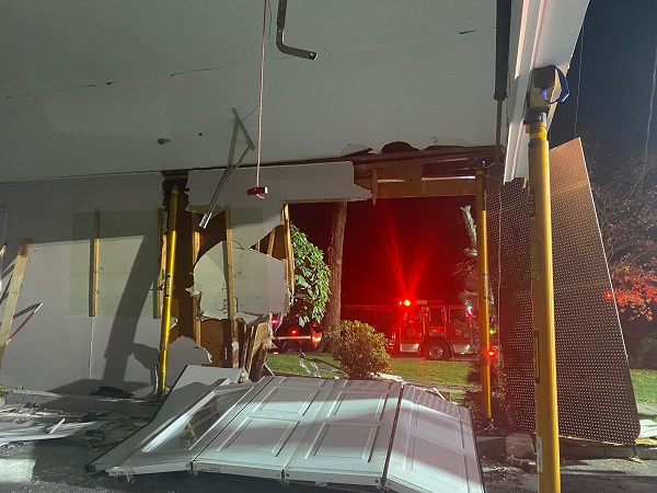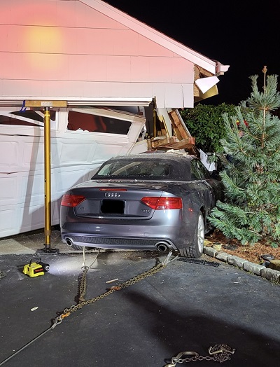 Firefighters arrived on scene and found that a passenger vehicle had collided with an attached garage of the residence at 32 Lynam Road. Firefighters found a significant amount of damage to the garage area of home and immediately began efforts to stabilize the structure. Upon the arrival of Rescue Company 1, personnel used specialized struts to prevent the roof of the garage from further collapse. Once the area was stabilized, fire personnel were able to use a grip-hoist device to safely extract the damaged vehicle from the garage area.